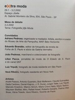 e(x)tra moda (29.01 a  03.02.2002) realizou-se durante a Semana da Moda de São Paulo com uma analise entre moda e arte por meio da fotografia.