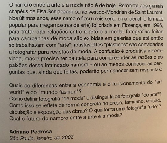 O namoro entre a arte e a moda não é de hoje. Remonta aos geniais chapéus de Elsa Schiaperelli ou ao vestido-Mondrian de Saint Laurent. Nos últimos anos, esse namoro ficou mais sério: uma bienal (o formato popular para megamostras de arte) foi criada em Florença, em 1996, para tratar das relações entre a arte e a moda; fotografias feitas para campanhas de moda são exibidas em galerias que até então só trabalhavam com “arte”; artistas ditos “plásticos” são convidados a fotografar para revistas de moda.